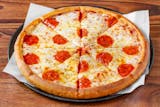 Baked in a shallow pan, topped with red onions, peppers, olives, feta cheese, and extra virgin olive oil.