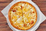 A sauceless pie topped with ricotta, mozzarella, and parmesan cheese.