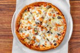 Topped with mushrooms, tomatoes, green peppers, onions, and olives.